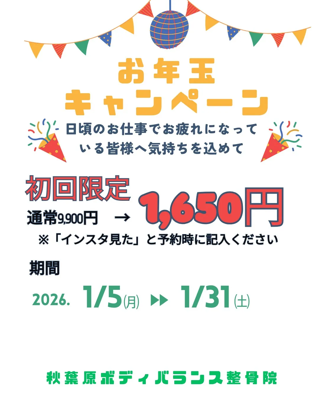 当院からのお年玉キャンペーンです。 2026/01/08 当院からのお年玉キャンペーンです。 予約の際に必ずインスタ見たとお伝えください!! お正月でたまった疲れはありませんか? 放置していた肩こり、腰痛。 今年は治したい方是非一度ご来院ください(^^)/